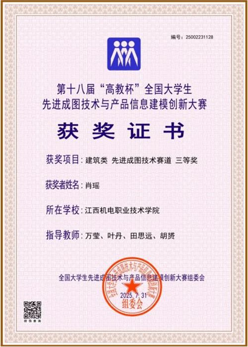 近日,第十八届“高教杯”全国大学生先进成图技术与产品信息建模创新大赛已经落幕。在数字传媒学院副院长叶丹、田思远老师的带领下,由陈伊、肖瑶、何定康、李迪、王凯峰、石子童、颜嘉欣、陈毅、温程平、艾思童和黄国民11名队员组成。经过多月的刻苦训练,队伍在获得第十八届大学生先进成图技术与产品信息建模创新大赛省赛多项个人二等奖、三等奖、团体三等奖后,再次在全国竞赛中斩获建筑类个人三等奖2项,团体三等奖1项。